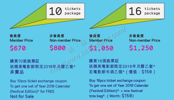 先來看看套票,今年香港亞洲電影節同樣推出了兩款套票,分別為十張與十六張換票証。會員價分別為670元與1,050元,而非會員價分別是800元與1,250元。凡購買套票一套均可獲得電影節月曆一套,而購買十六張換票証更加送電影節布袋。套票即日起於早上十時半至晚上十時,在百老匯電影中心會員部發售。