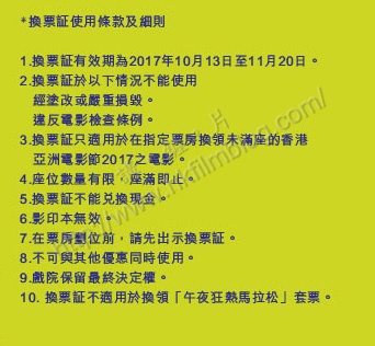 不過,使用套票有著一定的條款限制,當中重點在於換票証不能於網上兌換,持票者需親身到票房出示換票証,換取未滿座場次戲票。而換票証有效期為十月三十一日至十一月二十日的第一階段節期,十二月第二部份節期不能使用。