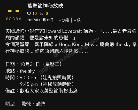 而根據主辦的Hong Kong Movie手機應用程式顯示,活動於十月三十一日星期二晚上九時起進行,先放晚上九時設有娃鬼拍照時間,而晚上九時四十五分則是神秘放映,更歡迎觀眾以萬聖節裝扮出席。