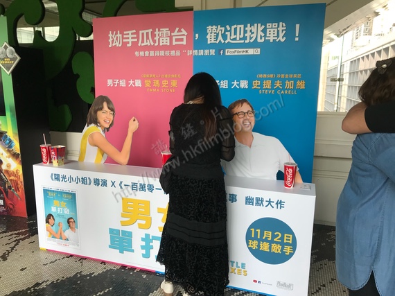 上圖所見,便是「講。鏟。片」情報人員日前到一家戲院所攝,可以看到該戲院正擺放了福斯發行擬於十一月二日上映的電影《男女單打戰》的電影宣傳品,原意是讓觀眾可以坐在宣傳品內與兩位主角來「拗手瓜」一較高下。以表達片中一場決定女子網球地位的男女單打的賽事。