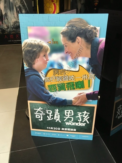 巴福斯發行改編自暢銷小說改編電影《奇蹟男孩》將於十一月三十日在港上映,而上圖所見便是電影於九龍灣影藝戲院入場處所見,可以看到變成了量度身高的指標,並且寫上超過一米高需要購票的對白。