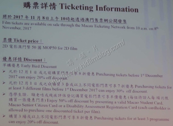 第二屆澳門影展的門票將於十一月八日上午十時起經由澳門售票網公開發售,2D電影票價維持在澳門幣五十元,而十二月一日前購買門票更可獲八折優惠,而且還有其他優惠。各位倘若對於選片有興的朋友,宜適時購票好了。