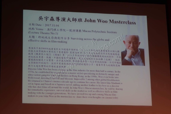 第一個大師班屬於導演吳宇森,以「跨地域生存與創作分享」作為主題,讓導演吳宇森與年青一代分享其經驗,以及不同市場的生存與創作技巧,而座談會同時邀請了兩位澳門新晉導演徐欣羨與陳嘉強一同分享。活動將於明天下午假澳門理工學院一號演講廳舉行,有關門票已經派發完畢。