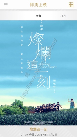 上圖所見,便是從英皇戲院手機應用程式的截圖,可以看到在「即將上映」的部份,出現了《燦爛這一刻》這部電影,電影被評為適合任何年齡人士觀看的一級,片長為105分鐘,上映日期則是十二月七日。而海報寫上導演陳果、張敬軒主演外,還有「輸在起跑線,贏在機遇前」的點題字眼。