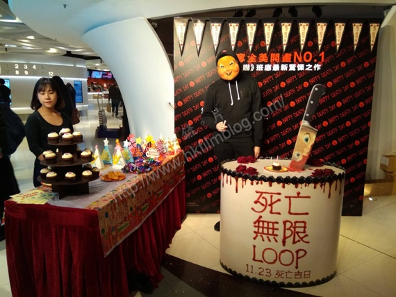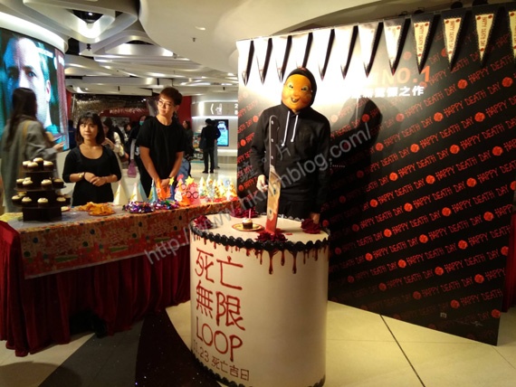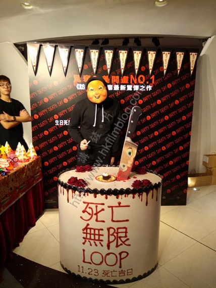 上圖所見,便是電影《死亡無限Loop》的優先場現場,可以看到有演藝人員扮演片中的面具殺人兇手的角色,並且切上生日蛋糕,供觀眾前來一起合照。