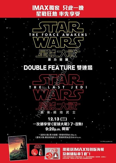是次的「星戰雙連場」,於IMAX影院舉行,分別於十二月十三日晚上九時二十分放映《星球大戰:原力覺醒》,然後小休過後,於十二月十四日零時零一分放映《星球大戰:最後絕地武士》。愛好星球大戰電影的觀眾,可籍此機會一氣呵氣承先啟後,並且對新一集電影先睹為快。