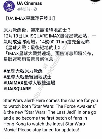 同樣設有「星戰雙連場」的,還有UA院線旗下的UA iSquare IMAX影院,該院線亦於十一月廿三日透過Facebook專頁宣佈將會放映「星戰雙連場」事宜,可是有關文章與留言在事隔兩天,卻不知何解下被刪除。而到了昨天傍晚約晚上七時,有關場次的門票卻忽然開售,票價也是275元。在短短半小時裡,已售出一半。