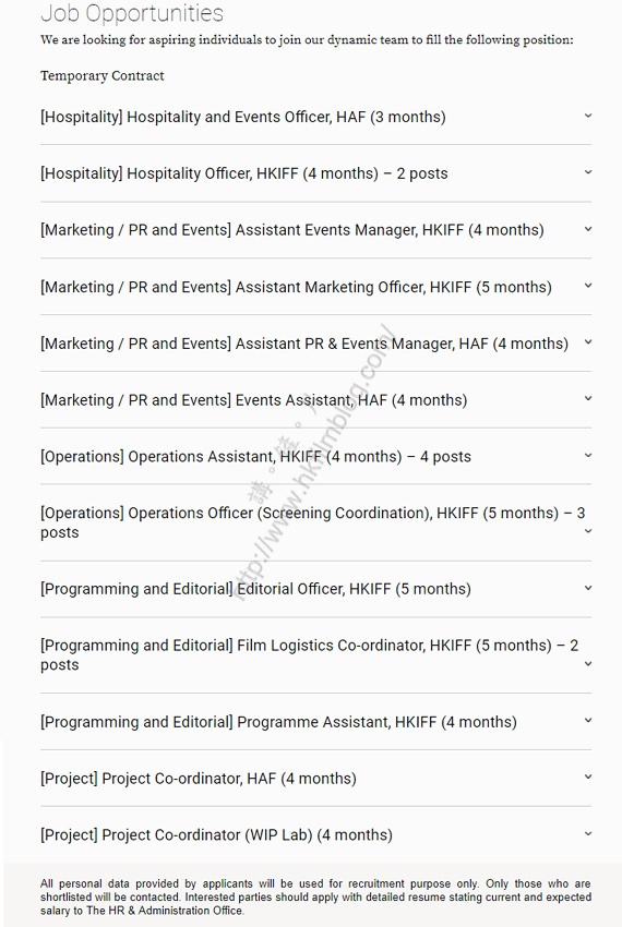 看看香港國際電影節的官方網站,現已開始招聘不同部門的崗位,從接待、市場推廣與活動、場地運作、以至是電影節節目與編輯等均有不同崗位需要人手,而該等職位均位短期合約職位,合約期由三個月至五個月不等。有意應徵有關職位的朋友,可以將詳細覆歷與期望的待遇送交香港國際電影節協會。