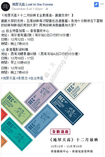 上圖所見,便是《地厚天高》在未來一周的放映情況,電影分別於十二月十二日與十五日晚上七時四十五分於香港藝術中心電影院放映,而十二月十六與十七日早上十時四十五分,以及十二月十八日晚上七時四十五分,則在香港電影資料館電影院放映,兩個放映場地座位逾百,並於一星期內公映五場。