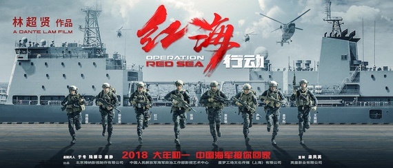 從《紅海行動》中國大陸版本,可以看到以海軍軍艦為背景,一眾演員由左至右分別是蔣璐霞、郭家豪、杜江、張譯、黃景瑜、尹昉、麥亨利與王雨甜。並且寫上「2018大年初一,中國海軍接你回家」的字眼。