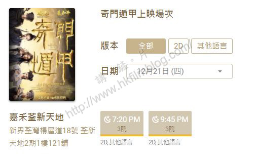 發行工作室在港發行、徐克監製兼編劇、袁和平執導的《奇門遁甲》雖然映期由十二月廿一日押後至明年一月四日,不過觀眾欲希望於今年在港觀賞《奇》片仍有機會,因為發行方面已安排電影於今天及明天作五場放映。
