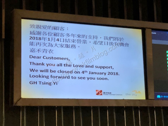 上圖所見,便是「講。鏟。片」情報人員昨天晚上於嘉禾青衣戲院所攝,可以看到該戲院票房的屏幕,已寫上「我們將於2018年1月4日結束營業」的字眼。