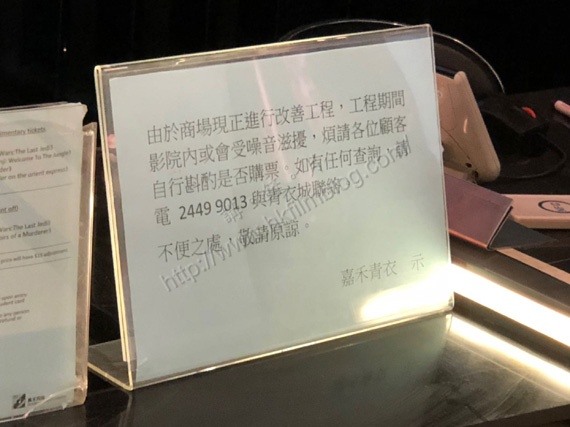 與此同時,該戲院票房亦貼上告示,指商場現正進行改善工程,影院內或會受噪音擾,觀眾需是行斟酌是否購票。
