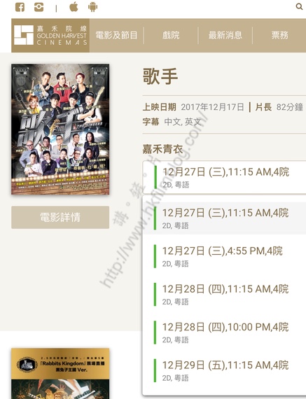 楊佳霖執導的《歌手》於本周一至周三在嘉禾青衣戲院四院上映三場,雖然除了首晚錄得五位觀眾外,其餘兩晚均只出現一人包場。不過看來片主希望讓更多觀眾給予電影機會,於是在十二月廿八日至三十日期間合共再映五場。當中包括三天的早上十一時十五分場次,以周十二月廿七日下午四時五十五分十二月廿八日晚上十時正場次。
