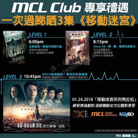有時意參的觀眾,需要是MCL Club會員,並於明年一月十五日早上十一時起於MCL德福戲院小食部旁的會員專區以120積分換領「《移動迷宮》系列馬拉松」通行証兩張。有意一氣呵成觀賞整個系列的觀眾,敬請把握機會好了。