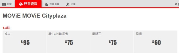 MOViE MOViE Cityplaza戲院共設有七個影廳,當中五個影院屬普通影院。其餘影廳包括MOViEMAXX大型影院與MM MOMENTS貴賓影院亦未試業。而五個普通影院票價均為95元。相比起毗鄰位於康怡廣場南座的Grand Kornhill Cinema的80元成人票價。有著15元的票價差距。