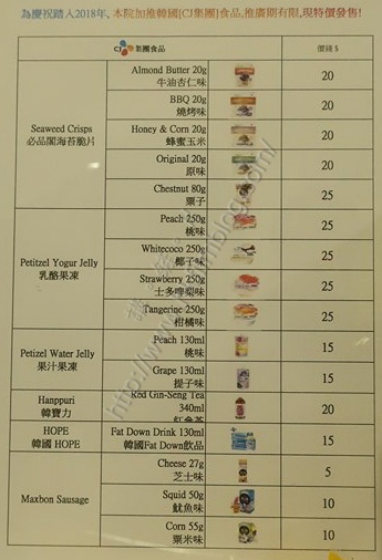 細心一看,其實是該戲院「為慶祝踏入2018年」,加推了韓國CJ集團食品,並以特價發售。而小食款式包括了不同口味的海苔脆片、乳酪果凍、果汁果凍以及是腸等,售價由五元到廿五元不等。