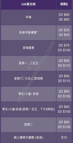 看看官方網站提供的票價資料,UA青衣城的成日基本票價為95元,不止比起嘉禾青衣的85元貴了十元,比起毗鄰地區嘉禾荃新天地的85元也貴了十元,即使比起票價進取的葵芳百老匯與荃灣百老匯的90元,也貴了五元。莫非是戲院的位置更上一層樓之時,就連票價也更上一層樓乎?