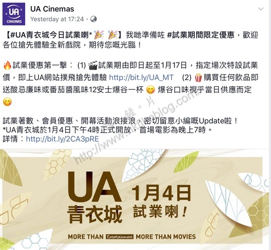 上圖所見,便是來自UA青衣城的通告,表示該戲院已於一月四日開始試業。而在UA院線的官方Facebook所見,該戲院於一月四日至一月十七日特設試業價,而購買任何飲品則送12安士爆谷一杯。