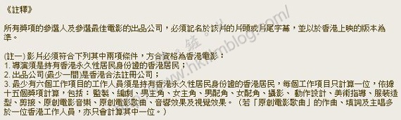 要看金像獎何以把這些電影列為香港電影,便需先了解香港電影金像獎協會怎去定義香港電影。在其官方網站看到,官方提供了三個條件,要符合其中至少兩個條件,方可成為香港電影。