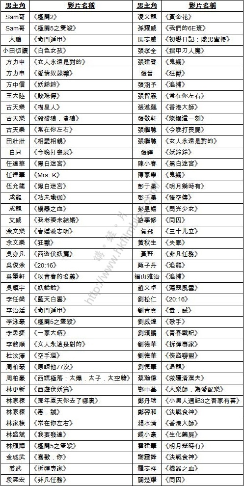去比起去年一部電影出現多位男主角報名,今年這個情況並不普遍。當中最多男主角報名電影也只報名三個名字,共有五部電影,分別是《女人永遠是對的》、《黑白迷宮》、《極闘5之雙殺》、《常在你左右》與《妖鈴鈴》。而兩部電影報名的,則有十六部電影,看來大部份電影,也只在男主角上填上單一名字。