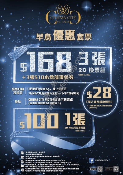 Cinema City Victoria將於一月十九日一連三天在戲院票房推出早鳥優惠套票,當中共設三款。第瑣久是三張2D電影換票証與三張十元小食部現金券,套餐售168元,每人限購五套。而2D版4DX電影換票証售價為一百元,每人限購十元,而開心價28元的「單人爆谷餐換領券」則只限購買電影套票的觀眾即場加購。全部優惠券有效期至十一月三十日,惟情人節及年三十至年初六停用。