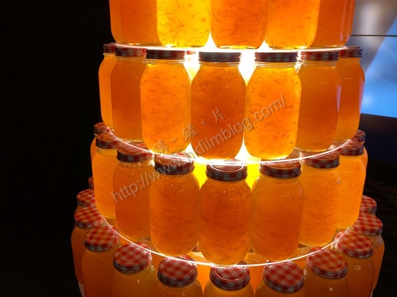 細看這些果醬樽,內裡看來是貨真價實。其實如斯的展示,再加上九層的樽頂部幾乎緊貼天花板,可以說是有點危險,但配上燈光又的確十分漂亮。不過戲院也架了圍欄,相信這個宣傳能夠擺放,也算是相信了觀眾對宣傳品的尊重和小心處理吧!