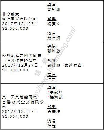 三個計劃裡,其中兩個計劃屬於兩位新導演的第二部長片作品。當中曾執導《大藍湖》的曾翠珊,以所屬的河上風光有限公司製作電影《非分熟女》,電影由楊寶文監製,初步演員陣容為蔡卓蔡,獲批資助金額為二百萬元。同樣獲得二百萬資助的,還有《N+N》導演賴恩慈的新作《怪獸家庭之四代同床》,製作公司為一毛製作有限公司,監製則為泰廸羅賓。