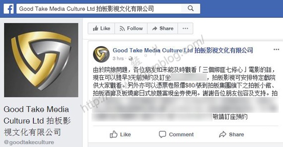 上圖所見,便是拍板影視文化有限公司在其官方Facebook上貼出的通告,當中指「由於院線問題」,倘若有觀眾未能及時觀賞《3個綁匪7條心》的話,可以提早三天致電及訂座,而拍板影視將安排特定戲院供觀眾覯賞。與此同時,亦可憑票尾到該集團旗下的食肆作現金券使用。