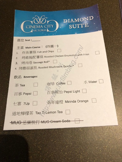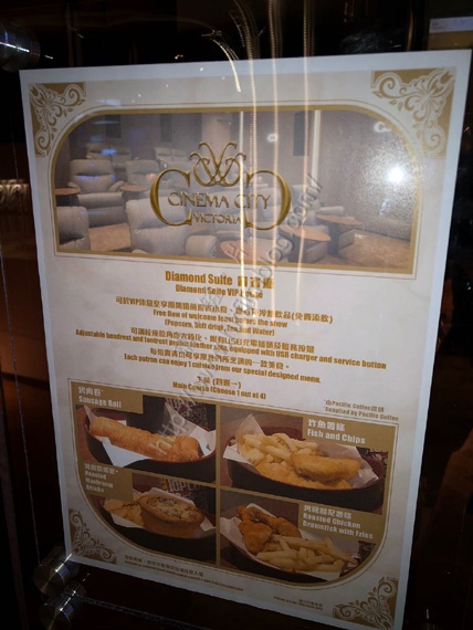 Cinema City Victoria的貴賓影院稱為Diamond Suite,共設有十個座位,另外四位為輪椅座位。而當在票房購票時,職員隨即遞上一份表格,填上所需的小食。Cinema City Victoria Diamond Suite票價為238元,當中包括了無限供應的爆谷與汽水,同時提供一份主菜。觀眾可從四個選擇選取一個,包括了炸魚薯條、烤雞搥配薯條、烤肉卷與烤磨菇蛋批。據悉前兩款由戲院自己提供,後兩款則來自Pacific Coffee咖啡廳。