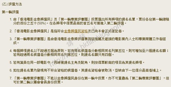 香港電影金像獎協會在其官方網站張貼了「第37屆香港電影金像獎評選細則」,當中在(乙)部評選方法中,第一輪評選第4點便指出「每個獎項提名以不超過五個為原則」,也即是金像獎常見的五個提名。