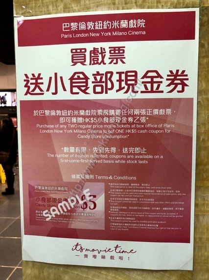 另一方面,巴黎倫敦紐約米蘭戲院現正推出優惠,購買任何兩張正價戲票便可獲五元小食部現金券乙張。