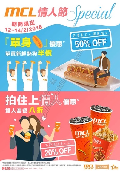 上圖所見,便是MCL院線提供的情人節特別優惠,優惠期由今天起直至情人節。當中針對情人的優惠,便是提供雙人套餐八折。