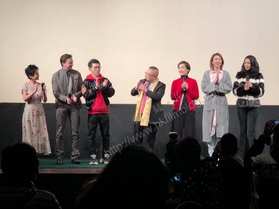 而就在電影完場之時,監製兼主演李居明連同導演任冠雄(左三),演員林寄韻、河國榮、江美儀、莊思敏與莊思明到了台上向觀眾謝票,同時講解拍攝時的心得。