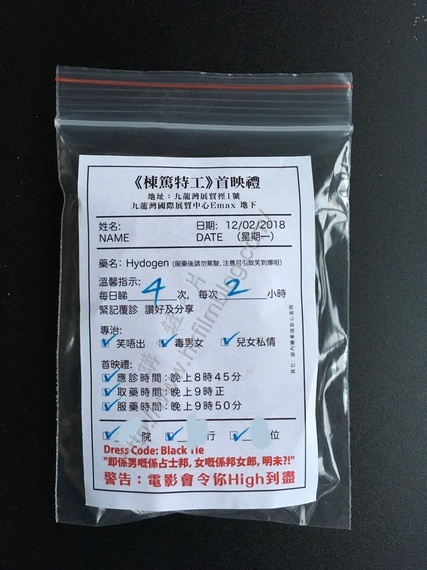中國3D發行、張家傑執導,黃子華與佘詩曼主演的《棟篤特工》已於昨晚舉行了首映禮,當中上圖所見便是首映禮戲票。整體首映禮戲票其實不像戲票,反而像是一包藥的藥袋。藥袋當中寫上了首映禮的時間、地點、流程,以及座位所屬的影院與座位位置。不過同時亦有搞笑的部份,例如「每日睇4次,每次2小時,緊記覆診,讚好及分享」以及「專治笑唔出、毒男女與兒女私情」。而藥名則為「Hydogen」。