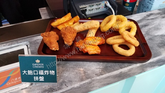 煎炸食物亦是不少戲院近年重點發展的小食,而英皇戲院在屯門新都商場推出「大飽口福炸物拼盤」,每客售價99元的炸物拼盤共有六款炸物,當中包括香辣雞中翼、BBQ雞中翼、拉絲炸芝士條、炸洋蔥圈與炸魷魚圈。