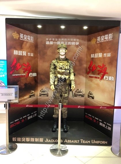 上圖所見,便是「講。鏟。片」情報人員於九龍站The Grand所攝,可以看到電影《紅海行動》的宣傳,當中電影除了出現巨型立體宣傳板外,還展示了在片的海軍特種部隊蛟龍突擊隊的制服。當中包括了上衣、褲、皮鞭、頭盔、護鏡,㡮庄是身上的背懙六其他裝備等。