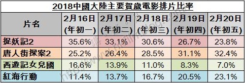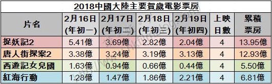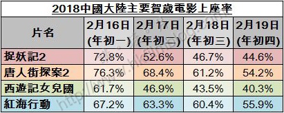 至於《捉妖記2》,雖然首集在中國大陸錄得紀錄性票房,不過第二集的主線跟上集截然不同,中國大陸觀眾並不受落,劣評湧現即時對繼後市場表現造成影響。至於《紅海行動》在初段予人主旋律味道,再加上電影以軍事為題亦有血腥成份,於大年初一觀看看來並不合適影響初一表現。不過隨著電影獲得理想口碑,再加上隨著年初一過去,而其主旋律味道遠輕於吳京的《戰狼II》,再加上觀眾或已看其他賀歲片,倒令觀眾回流令票房上升。