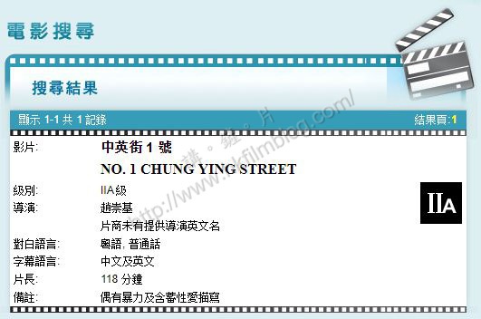 上圖所見,便是來自負責電影檢查的電影、報刊及物品管理辦事處的結果,當中顯示趙崇基執導的《中英街1號》片長為118分鐘,對白語言為粵語與普通話,並配有中、英文字幕,電影被評為II A兒童不宜的級別,註則標示電影「偶有暴力及含蓄性愛描寫」。