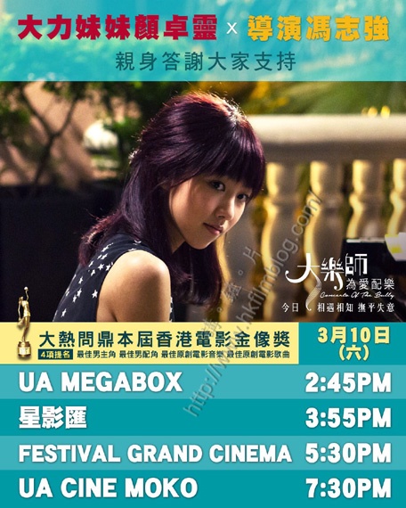 上圖所見,便是電影《大樂師.為愛配樂》本周末的謝票情況,電影將安排於三月十日星期六分別於九龍灣UA MeagaBox與星影匯、九龍塘Festival Grand與旺角UA CineMoko進行謝票,屆時導演馮志強與女主角顏卓靈均會出席以答謝觀眾支持。