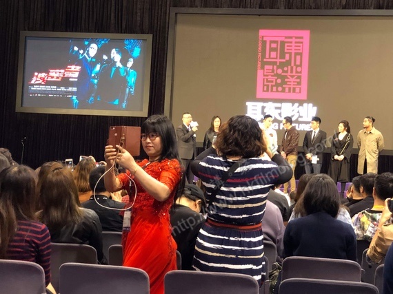 上圖所見,便是在耳東影業記者會上的情況。當中電影《洩密者》正在發佈之時,台下卻出現兩位稀者。先是左方出現一位衣著跟酒樓知客相若的女士,而右方則出現一位中年裝束的大媽,兩人當看到台上一眾演員時,均不約而同時起身拍照,當中的一位疑似知客更是自拍,同時展現自己巨大的臀部。如斯的畫面,實在是非常奇趣。