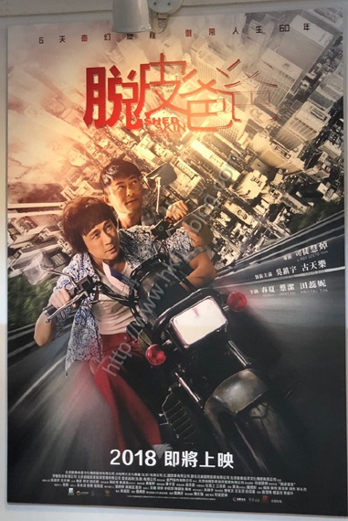 上圖所見,便是「講。鏟。片」情報人員在今年香港國際影視展期間,於嘉聯娛樂的攤位所見,可以看到新一款的《脫皮爸爸》海報,海報裡的吳鎮宇不再以老裝出現,反而是以後生的裝束駕著電單車,而飾演兒子的古天樂則在電單車的後座。上方寫上「6天奇幻甦醒,倒帶人生60年」的字眼,同時寫上合演的春夏、蔡潔與田蕊妮的名字。