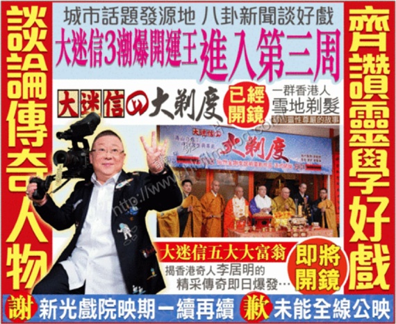 上圖所見,便是最新的《大迷信3潮爆開運王》的廣告,當中當然寫上「新光戲院映期一續再續」,不過當中更有趣的便是出現《大迷信四大剃度》已經開鏡的情況,同時寫上一群香港人雪地剃髮,並且以尋回靈性尊嚴的故事作主題。