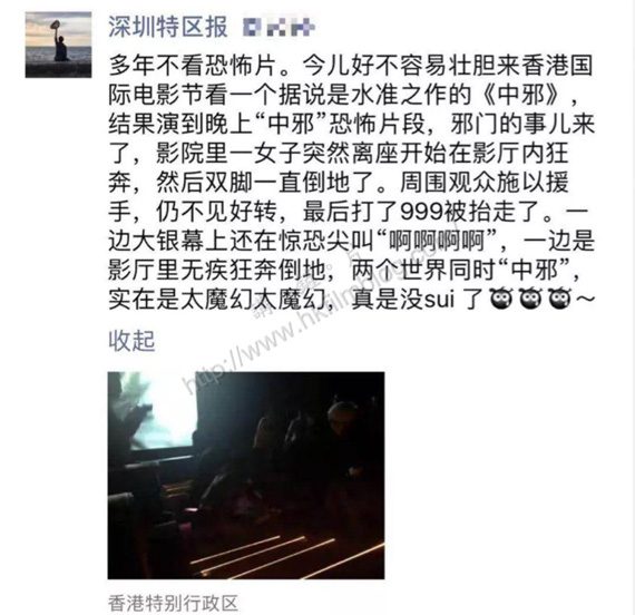 《中邪》原先是一部極低成本(七萬元人民幣)的偽紀錄片,題材是以年輕人到農村拍攝「還陽」和「驅邪」為主線,從而引及一連串意想不到的事。早前在香港上影時,曾有報導說有女觀眾被嚇暈,不過當時有不少人懷疑其真實性,會不會是一種炒作的套路。其實這部電影算是2016年被本的翻拍版,現在等待上映的是2018升級版,投資共兩千萬元人民幣,這好像還真的是只有大陸電影才會出現的怪事。