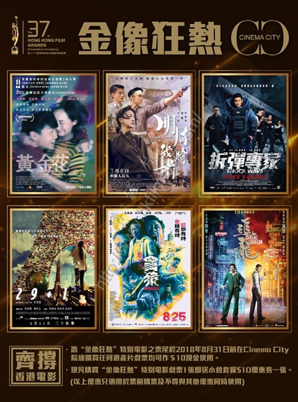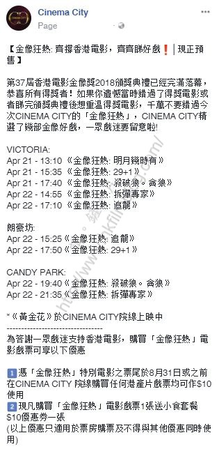 上圖所見,便是Cinema City在其官方Facebook網站張貼的通告,可以看到該戲院推出「金像狂熱」的活動,當中除了繼續放映高先發行、陳大利執導的《黃金花》外,更別安排於本周末及周日放映五部應屆得獎電影,當中包括發行工作室發行、許鞍華執導的《明月幾時有》;中國3D發行、彭秀慧執導的《29+1》;巴福斯發行、葉偉信執導的《殺破狼.貪狼》;寰宇發行、邱禮濤執導的《拆彈專家》;以及星王朝發行、王晶與關智耀合導的《追龍》。