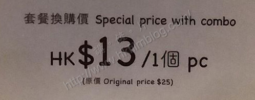 不過細心一看,其實十三元一個朱古力甜甜圈,其實只是「套餐換購價」,原價卻要二十五元。如斯的說明方法,看起來真的好像是否有點出其不已呢?可是,倘若觀眾要到購買時,才得悉不是加配的原價時,還是會嚇怕即時不去購買,還是奉勸在推廣時,也可以在標示上「老實」一點吧!