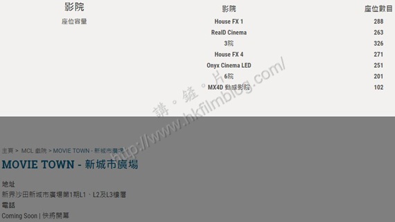 上圖所見,便是截圖自MCL旗下的官方網站,可以看到Movie Town共設有七個影廳,當中一院與四院設有FX音響系統,分別命名為House FX 1與House FX 4,分別設有座位288位與271位。三院與六院並沒有特別命名,當中三院設有座位326位,屬於七個影廳最大的一間,而六院則設有座位201位。