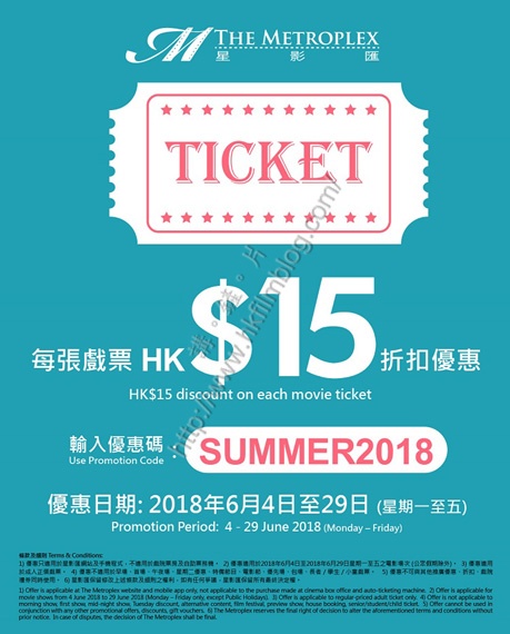 上圖所見,便是星影匯是次提供的票價優惠,觀眾透過星影匯網站或是手機應用程式,輸入優惠碼來購買六月四日至六月廿九日期間星期一至五平日戲票,便可以獲得十五元的票價優惠。然而有關的優惠卻不能於星期二票價特惠日使用,而電影節的戲票亦不適用。