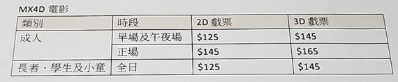 而MX 4D電影票價方面,成日正場2D票價為145元,早場與午夜場則為125元,至於長者、學生與小童票價則一律為125元,而3D票價則會較2D上調二十元。
