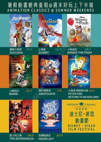 是次英皇戲院的「迪士尼.彼思」動畫節,將會在七月十四日至八月五日同時於中環娛樂行與屯門新都商場兩間英皇戲院舉行,當中合共選映八部動畫,當中包括《優獸大都會》、《小飛象》、《小熊維尼》、《小鹿斑比》、《貓兒歷險記》、《小飛俠:飛越夢幻島》、《超人特工隊》與《玩轉腦朋友》。